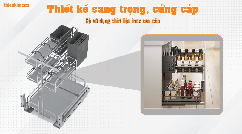 Chiếc kệ lắp âm này còn có bộ ray trượt giảm chấn giúp thao tác đóng mở tủ nhẹ nhàng, hạn chế va đập.