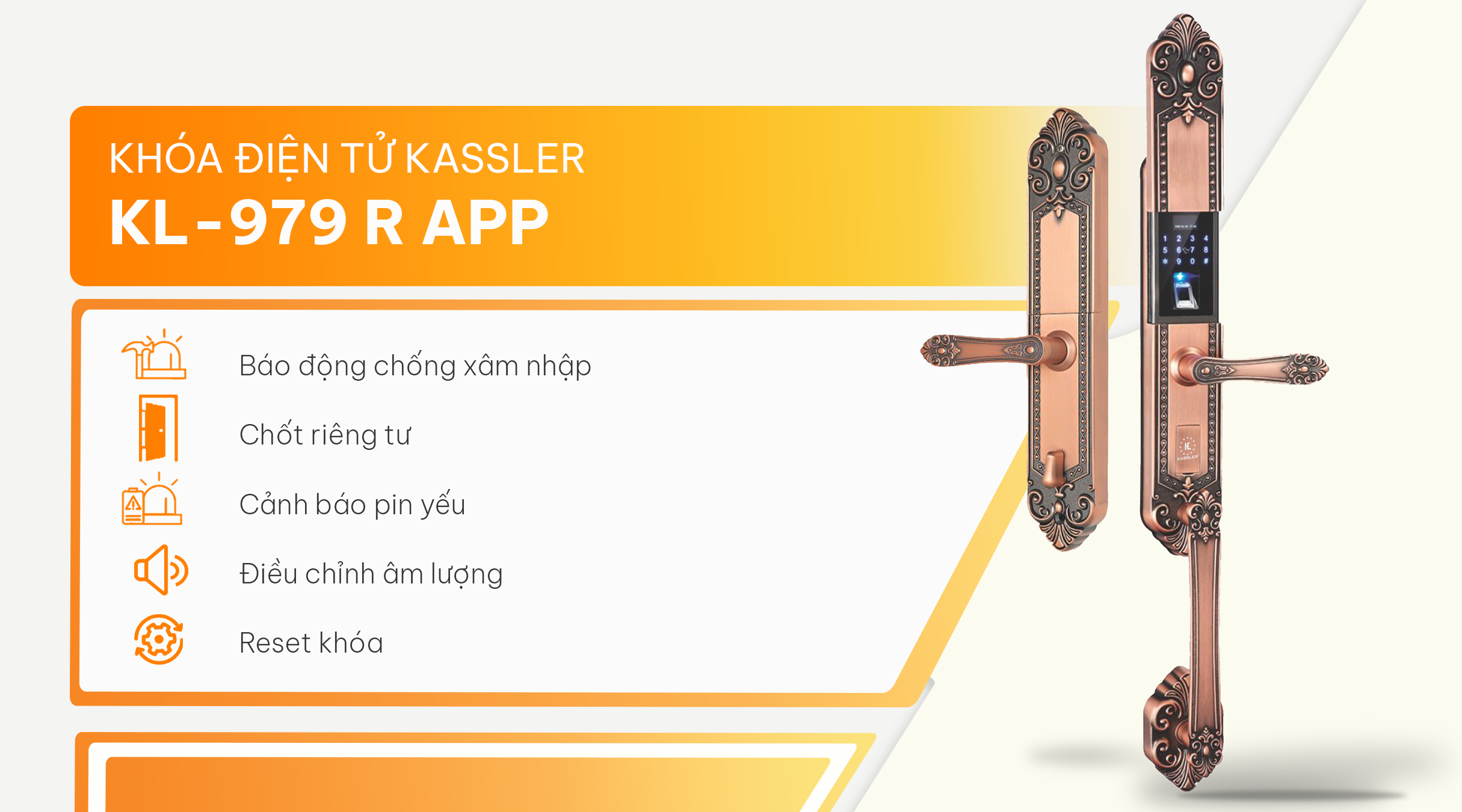 Kassler KL-979 R APP mang đến sự tiện lợi vượt trội với 5 phương thức mở khóa linh hoạt: vân tay, mã số, thẻ từ, chìa cơ truyền thống hoặc thông qua ứng dụng trên điện thoại. Tính năng mã số ảo giúp bảo vệ mã số thật bằng cách thêm các chữ số ngẫu nhiên, ngăn chặn hoàn toàn nguy cơ bị lộ mã khi có người nhìn lén.