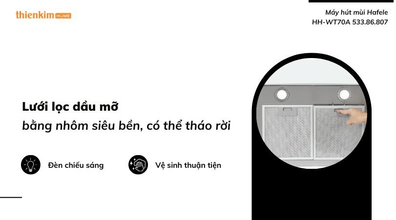 Máy hút mùi đến từ thương hiệu Hafele còn tích hợp thêm hệ thống đèn chiếu sáng vô cùng tiện lợi. Hệ thống đèn sẽ cung cấp lượng ánh sáng cho bạn dễ dàng thực hiện các thao tác nấu bếp.