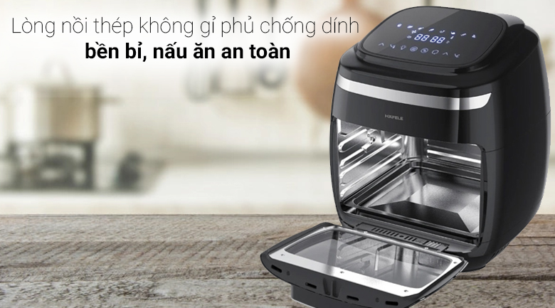 Nồi chiên không dầu Hafele tạo điểm nhấn hiện đại cho không gian sử dụng với chất liệu vỏ nhựa, inox, cửa kính sang trọng.