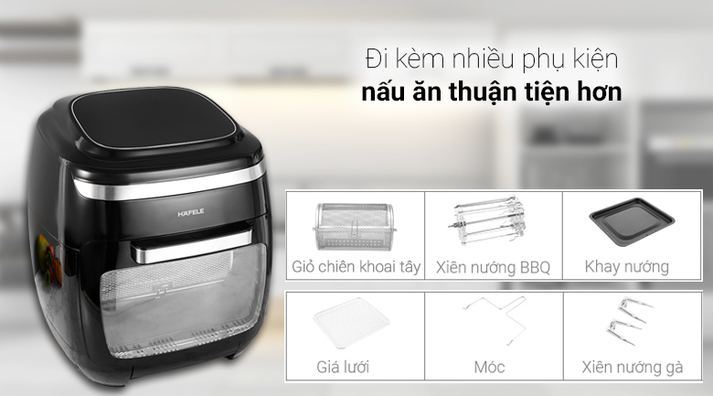 Nồi chiên không dầu Hafele AF-602A/ 535.43.711 có cách phụ kiện đi kèm bao gồm giỏ chiên khoai tây, xiên nướng BBQ, xiên nướng gà có thể nướng gà nguyên con 1.2 kg, khay nướng, móc lấy giỏ xoay, giá lưới hỗ trợ bạn chuẩn bị các món ăn thêm thuận tiện, nhanh gọn.