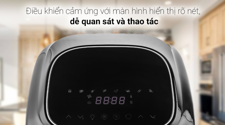 Bảng điều khiển của Nồi chiên không dầu có các nút tùy chỉnh (đi theo thứ tự từ trái qua phải):