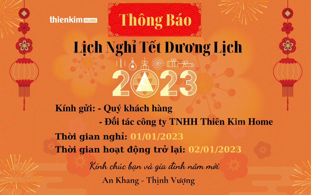 Công Ty TNHH Thiên Kim Home xin gửi đến quý khách hàng và đối tác lịch nghỉ Tết Dương Lịch 2023. Chúc bạn và gia đình năm mới an khang và thịnh vượng!